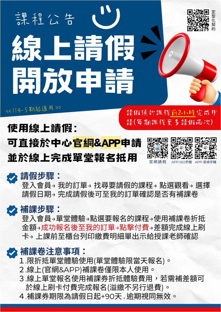 1 .請假須於課程開始前2小時前完成,每期課程限請假兩次。