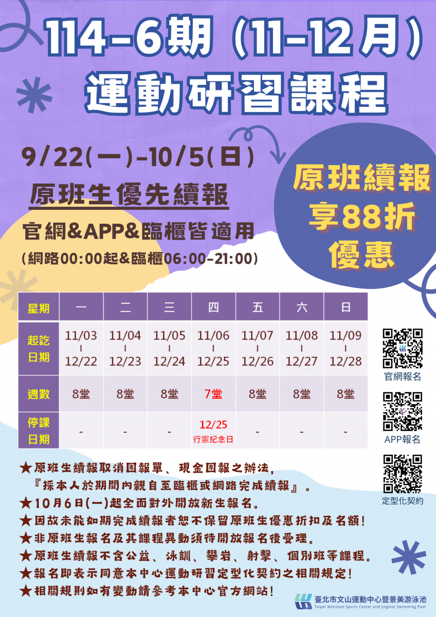 【114-6期(11-12月)運動研習課程|原班生續報期程】 ★9/22(一)~10/5(日) 原班生續報享88折優惠 ★網路、APP及臨櫃皆適用(線上00:00起;臨櫃06:00-21:00) ★新生、非原班生預計開放報名日:10月6日(星期一) ★官網報名:請點我 ★ APP 報名:請點我 建議多利用網路系統報名,方便、快速、免排隊 ★運動研習定型化契約:請點我 #運動研習 #原班生續報 #文山運動中心 #景美游泳池