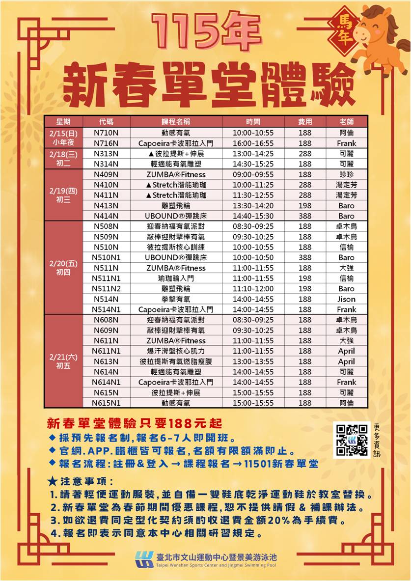 【新春單堂體驗課程】 ★單堂體驗只要188元起~ ★即日起網路&臨櫃皆可報名 ★採預先報名制,報名6-7人即開班。 ★官網.APP.臨櫃皆可報名,名額有限額滿即止。 ★報名流程:註冊&登入→課程報名→11501新春單堂 ★網路報名:請點我(另開連結) #新春單堂體驗 #馬年迎新春 #馬上報名搶得先肌 #文山運動中心