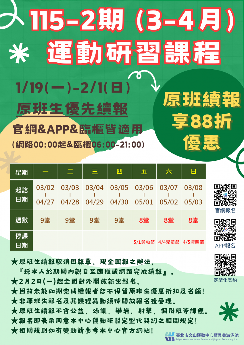 【115-2期(3-4月)運動研習課程|原班生續報期程】 ★1/19(一)~2/1(日) 原班生續報享88折優惠 ★網路、APP及臨櫃皆適用(線上00:00起;臨櫃06:00-21:00) ★新生、非原班生預計開放報名日:2月2日(星期一) ★官網報名:請點我 ★ APP 報名:請點我 建議多利用網路系統報名,方便、快速、免排隊 ★運動研習定型化契約:請點我 #運動研習 #原班生續報 #文山運動中心 #景美游泳池
