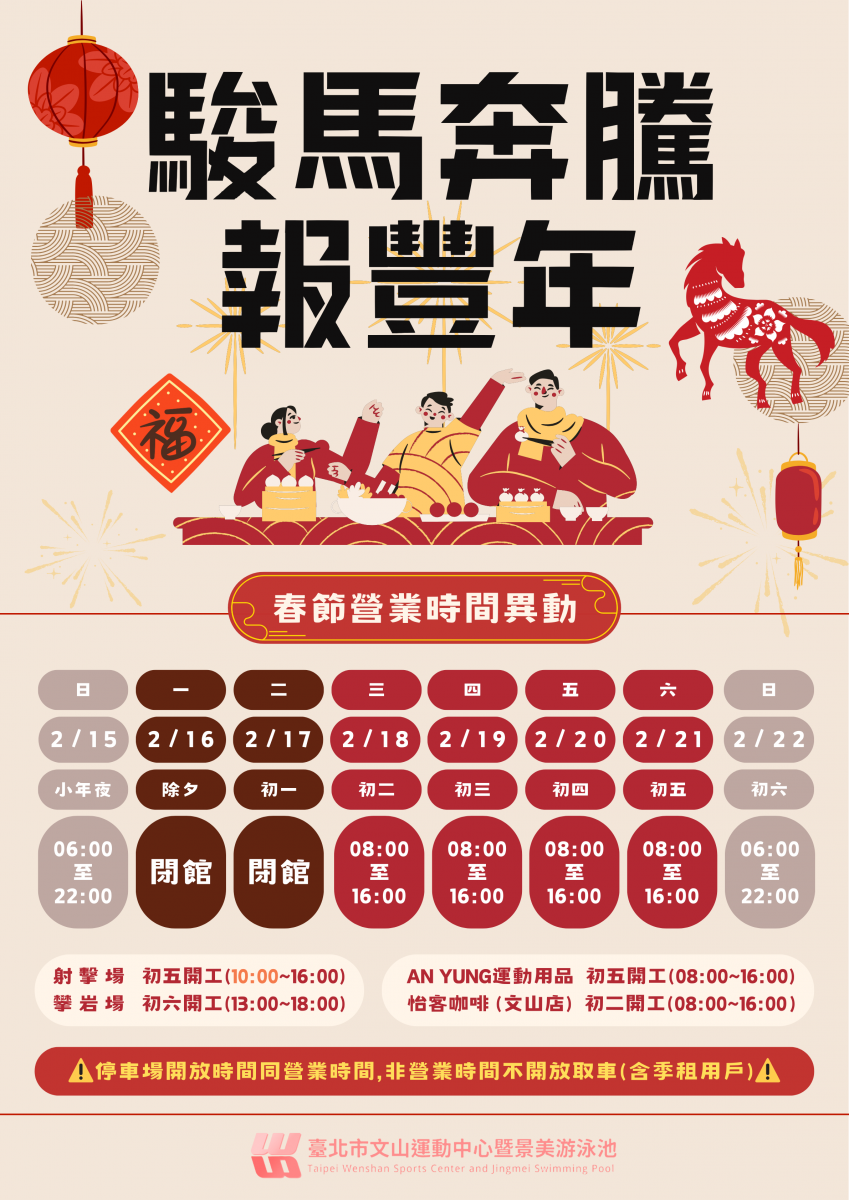 ︵︵︵︵︵︵ 春節營業時間 ︶︶︶︶︶︶ ⚠停車場開放時間同營業時間,非營業時間不開放取車(含季租用戶)⚠ 丙午馬年象徵速度、成功與勇氣♥ 文運預祝大家~ 馬年活力全開,健康平安伴你跑! 過年期間好運不間斷,文運陪您過好年!